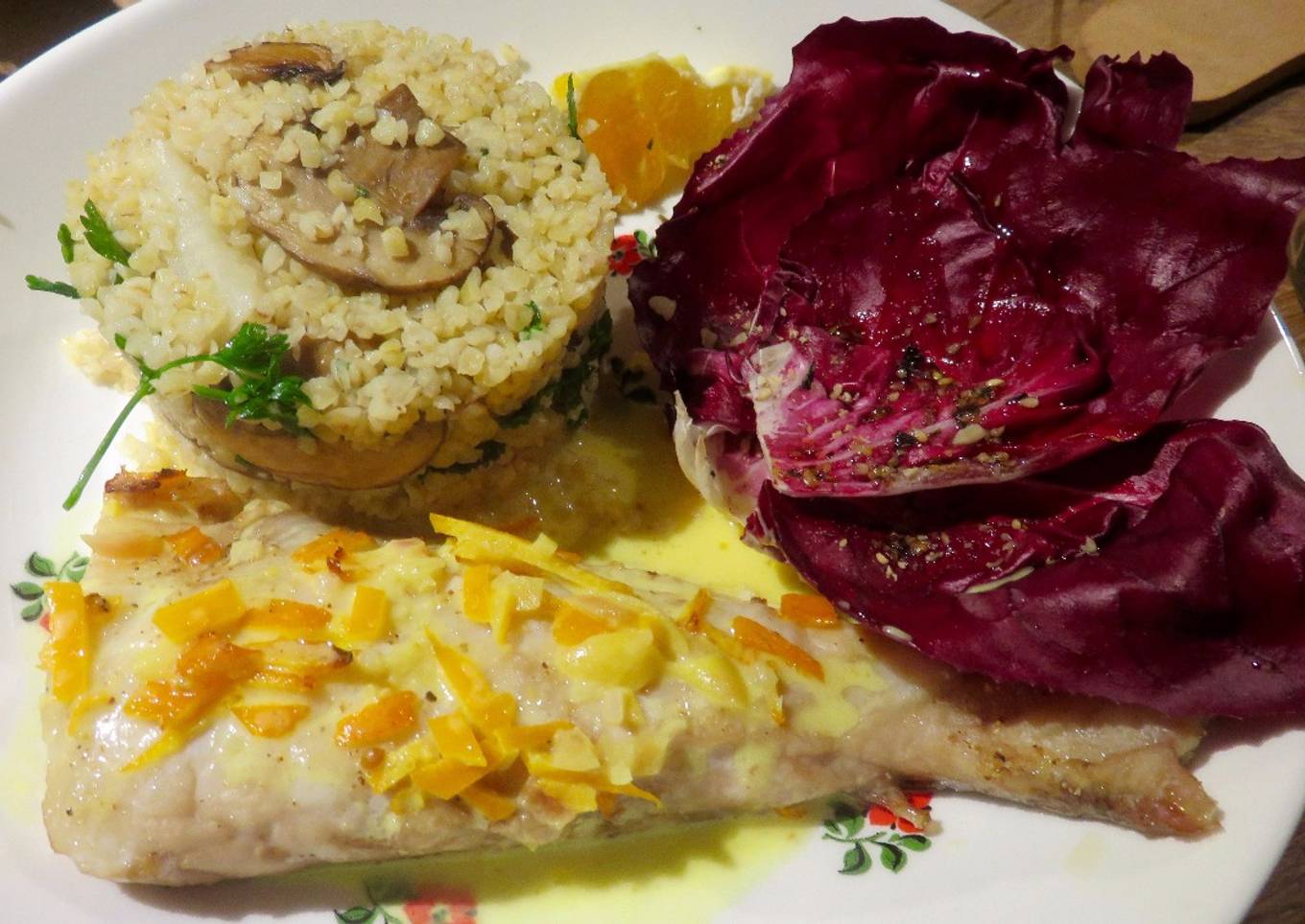 - Sortez les filets de poisson du four, disposer les dans des assiettes avec une garniture moi j'ai choisi boulgour, champignons, choux kale et céleri rave avec une feuille de salade. Pour finir napper votre poisson avec la sauce. Déguster immédiatement