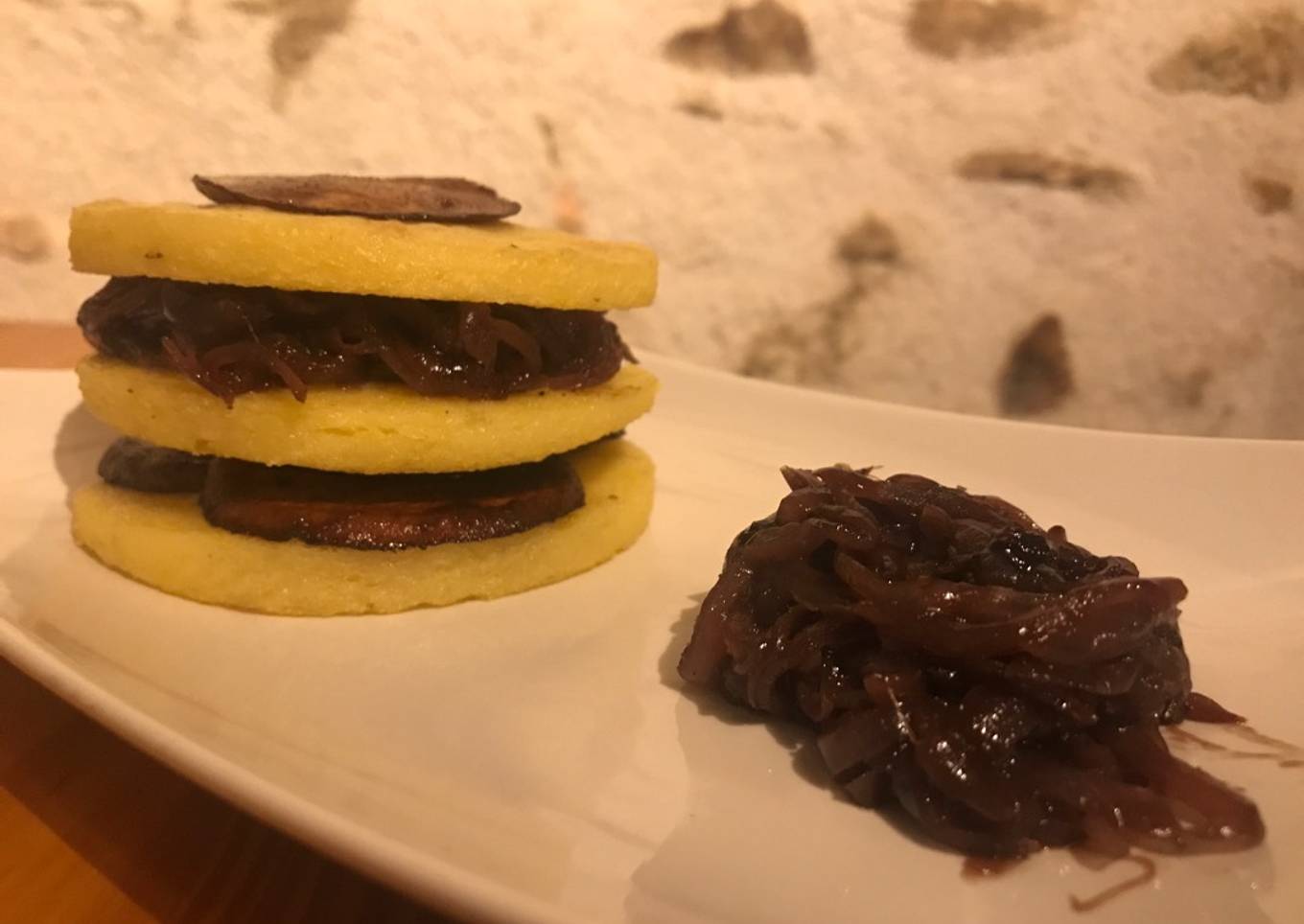 - Pour finir, monter le burger en mettant une cercle de polenta, les champignons en tranche, un cercle de polenta, le confit d’oignon et une dernière tranche de polenta grillée.
