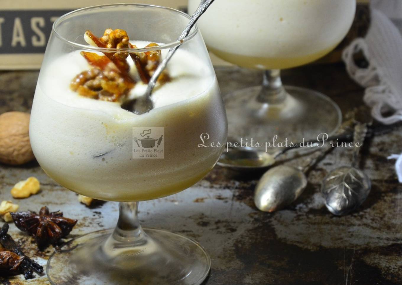 Cassez le caramel aux noix en éclats, et déposez les sur la mousse aux poires. - Attention : la mousse à l'aquafaba n'est pas aussi stable que celle avec les blancs en neige : préparez cette mousse tout au plus une heure avant de la servir...