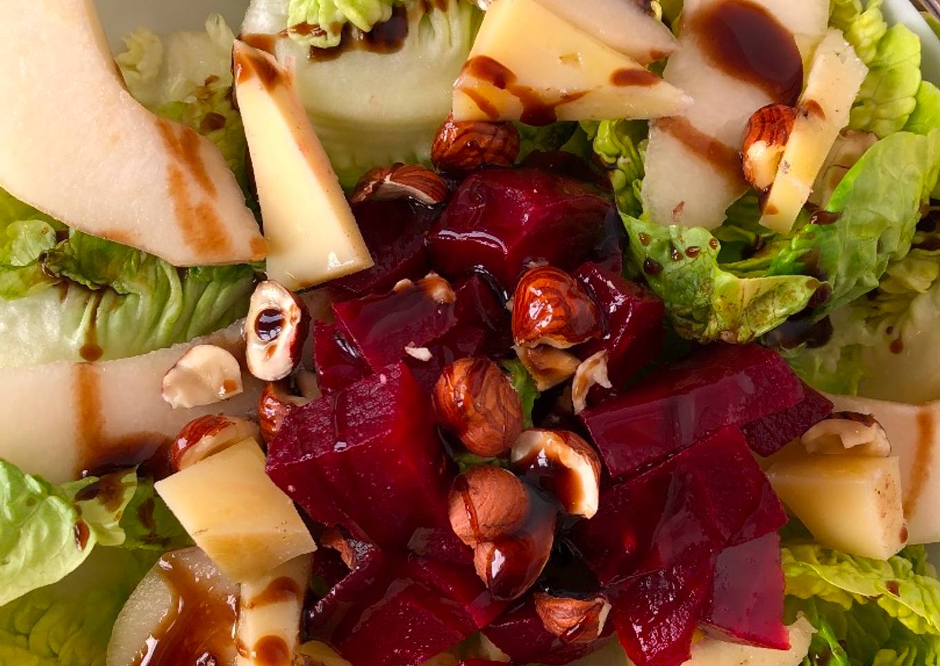 - Laver et essorer la salade et la mettre dans une assiette creuse puis ajouter des morceaux de betterave et de poires, puis de tome. Arroser d'huile et vinaigre et parsemer de quelques noisettes cassées, et déguster.