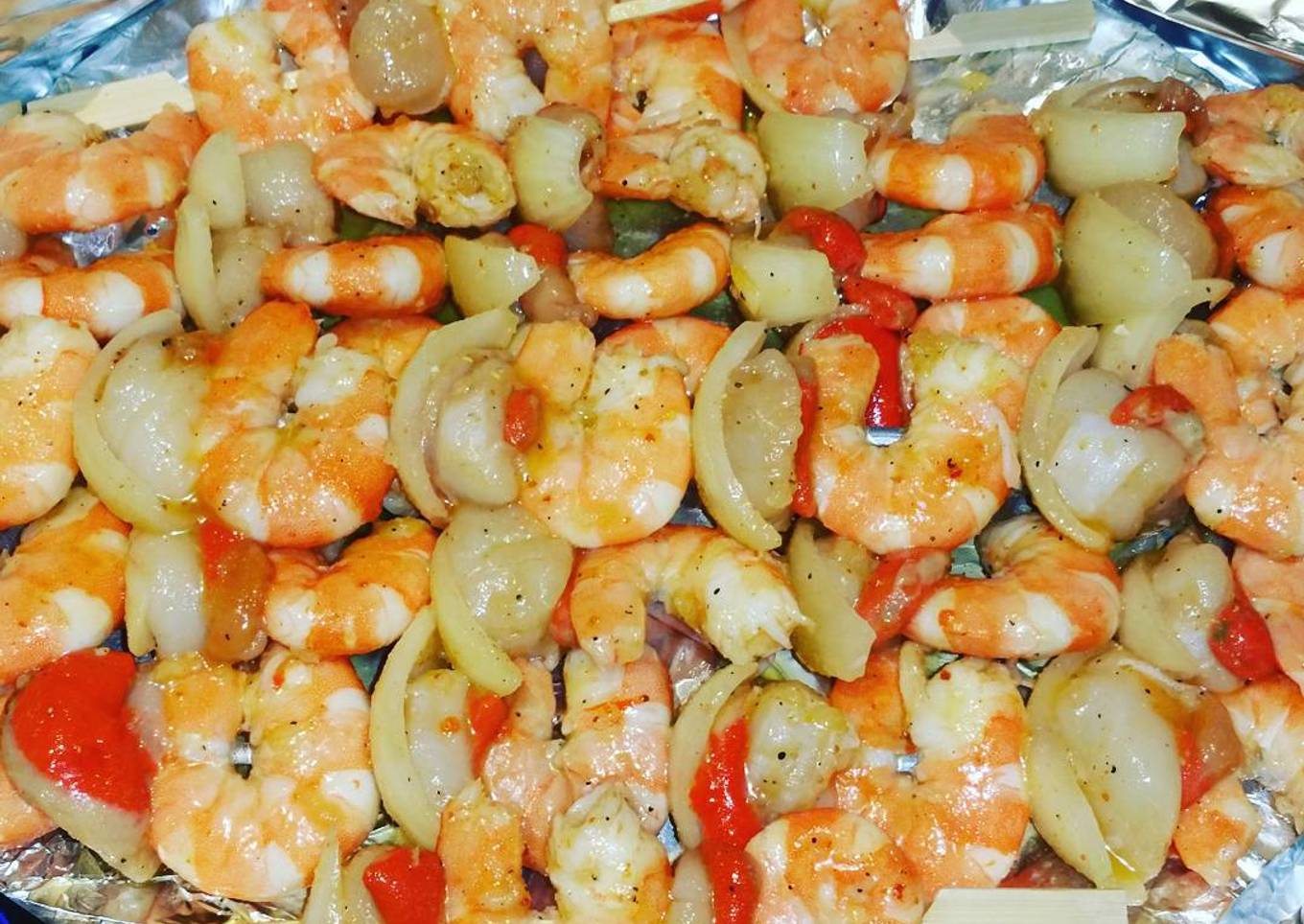 - Tout d'abord faire mariner les crevettes décortiquées en laissant les queues et les noix dans l'huile d'olive, piment,ail écrasé,tomates coupées en morceaux et l oignon en lamelles pendant 1h. Ensuite mettre tout en brochettes