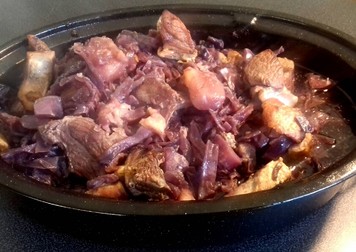 Épaule de porc, chou rouge et pommes en cocotte