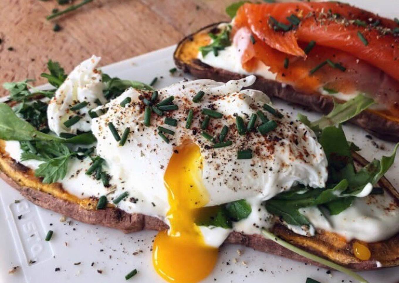 - Puis, sur l’une venez y déposer un œil poché. Sur l’autre, une tranche de saumon fumé. N’oubliez pas de les assaisonner à votre convenance.