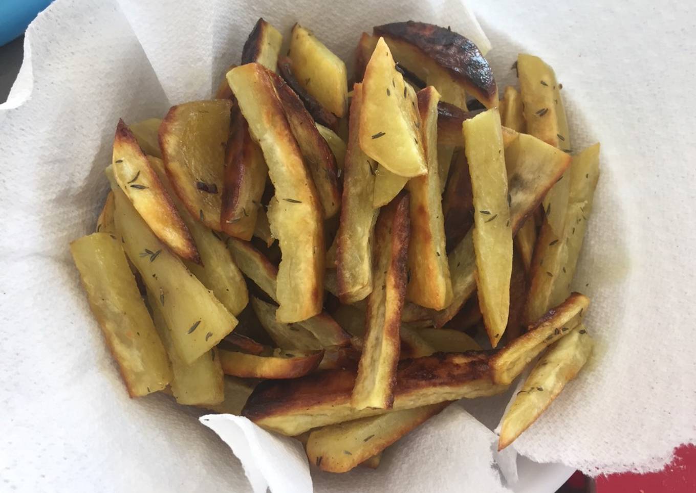 - Mettre de l’huile sur les patates, ajouter le sel et le poivre et y parsemer du thym